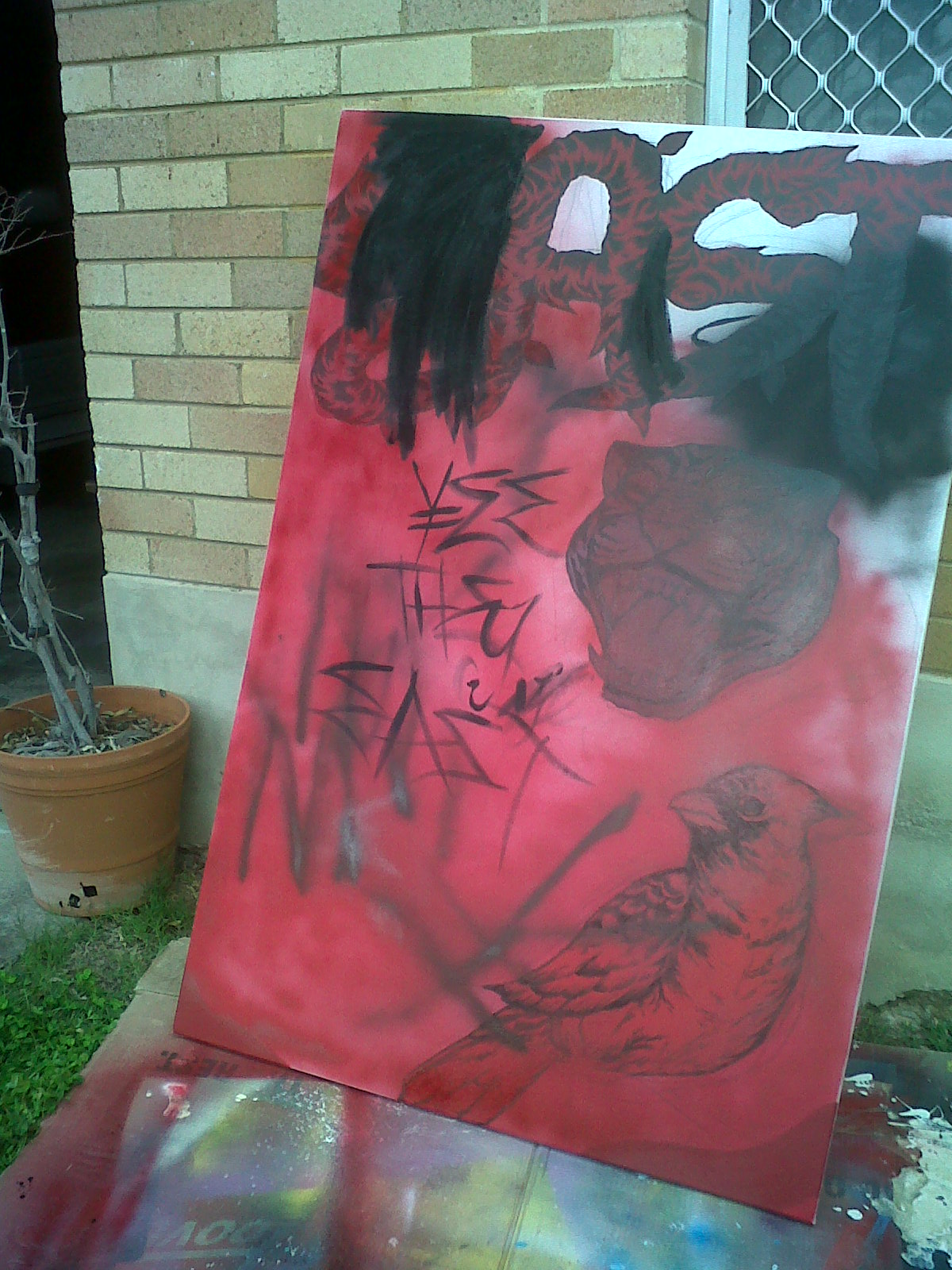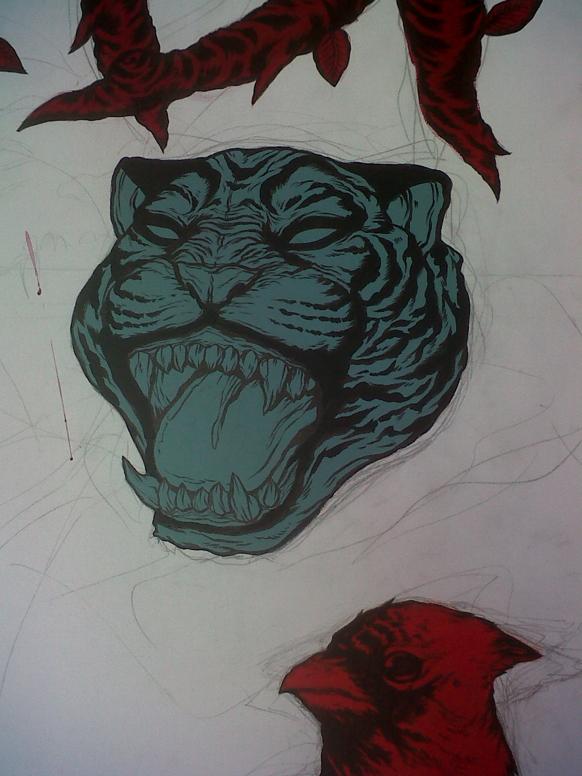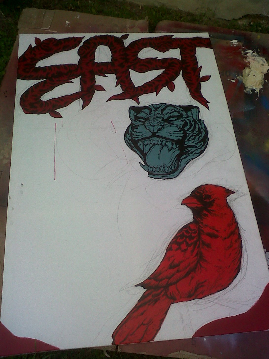 Ive had this massive canvas (maybe 1m x 1.5mish) lying around the house for roughly 2 years, unfinished with the word East, a tiger face and some random bird chilling around. When I started this thing I really like the way the tiger turned out so i swore not to touch it until i thought of something cool……..that never happened.