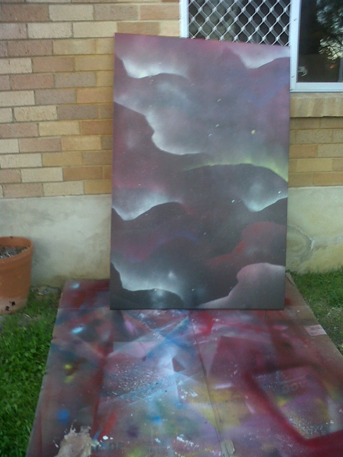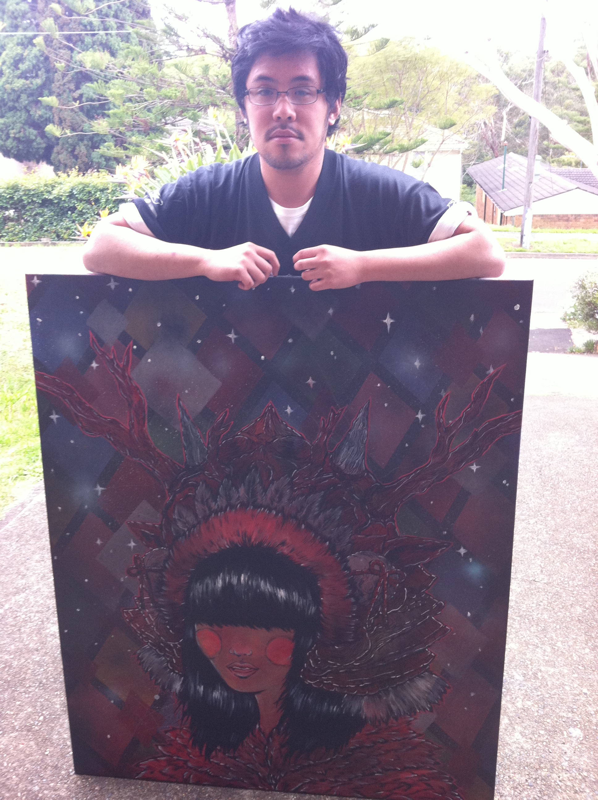 Well when this exhibition rolled around I knew i needed one giant confronting piece as an ode to Japan and canvas’ of that size are hard to find. So It had to be done, sprayed over as a fresh slate I unintentionally recreated steamed hams and the Aurora Borealis. check it.
