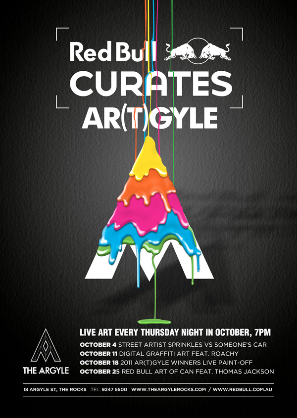 Redbull: Ar(t)gyle 2 October 17, 2012October 17, 2012 | Chris Late Notice, but after the success of last year’s event I’m back again painting live at the Argyle. Tomorrow October 18 starting at 7. So yeah come for some drinks and chill, i’ll be there with artist Cam Wall doing our thing. Related