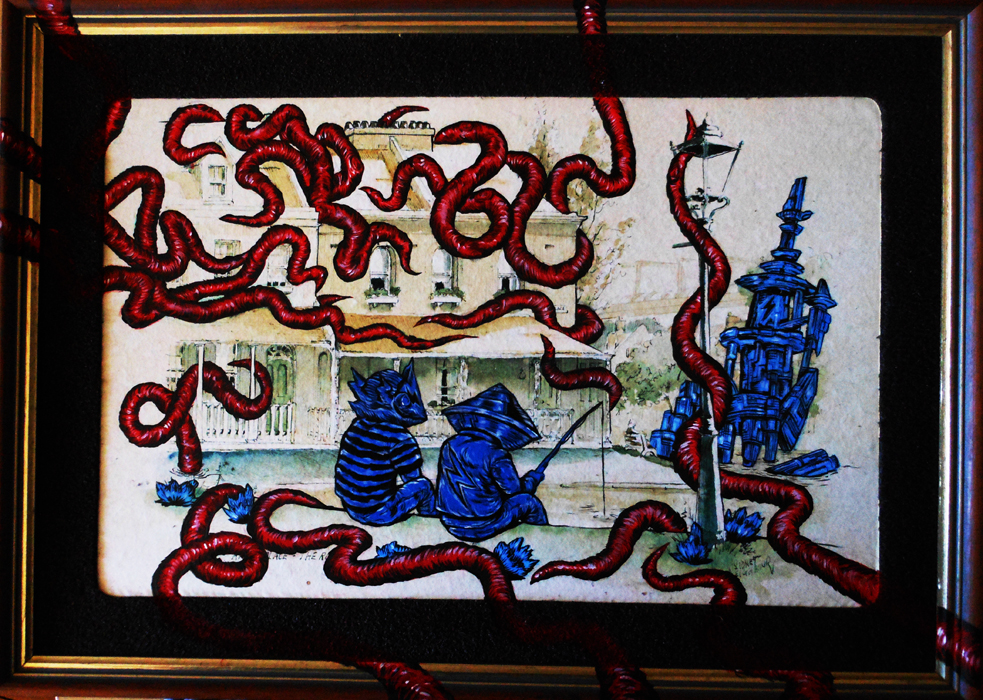 All artists were asked to paint over vintage materials to bring “new life” and reinterprut meanings behind them.