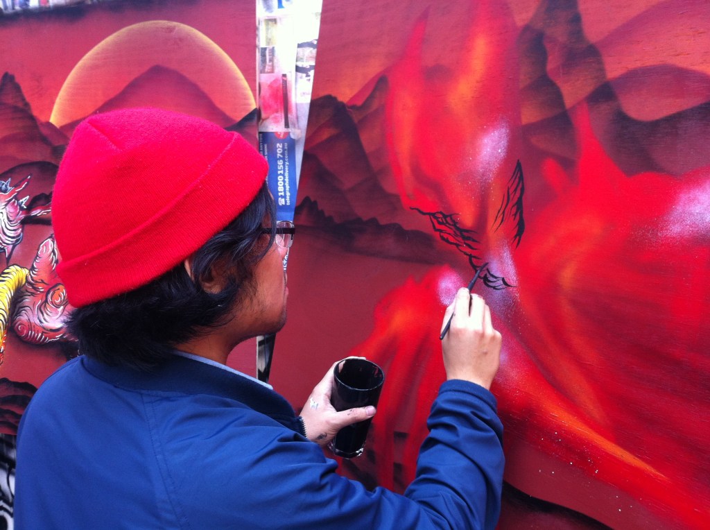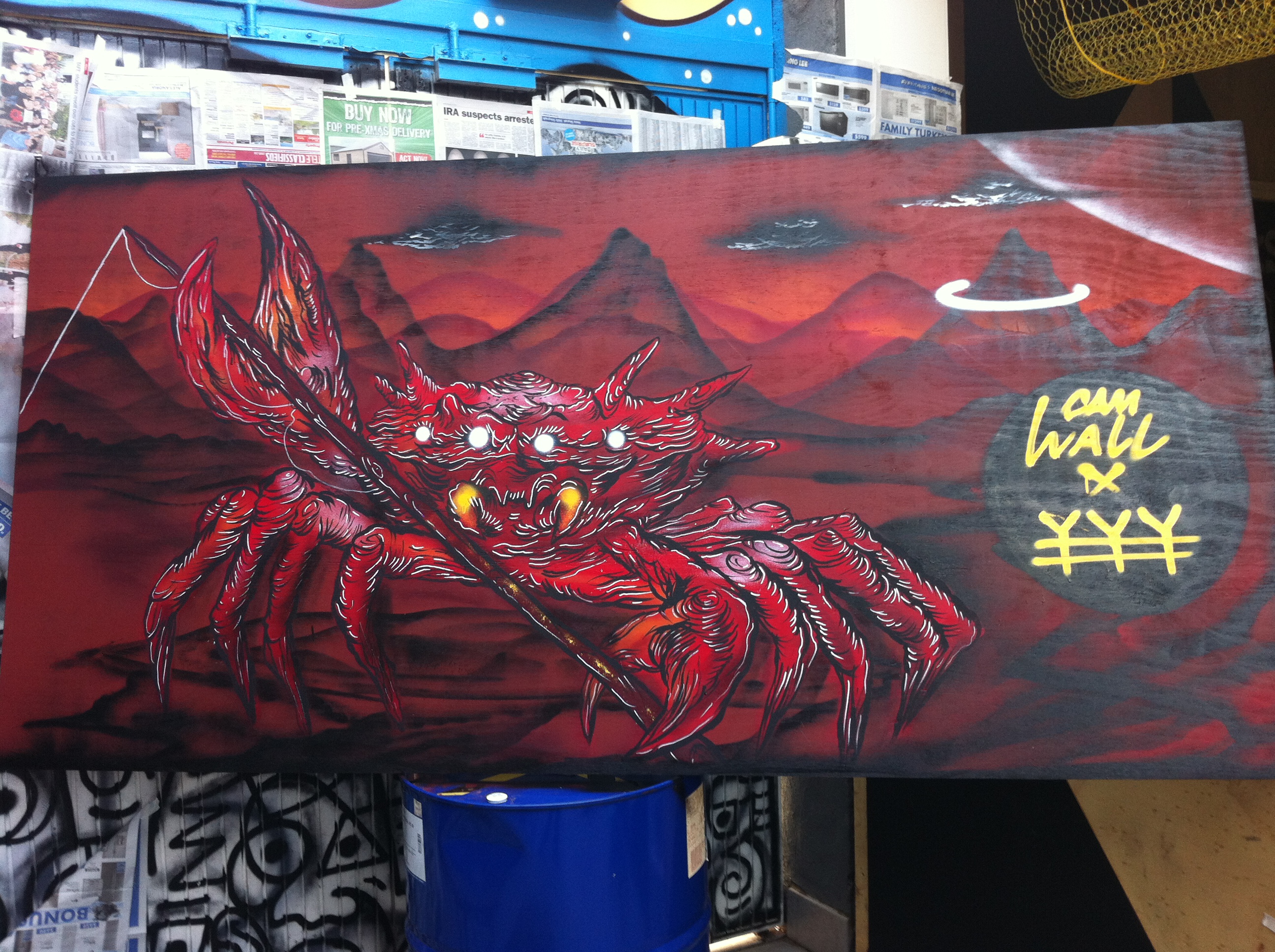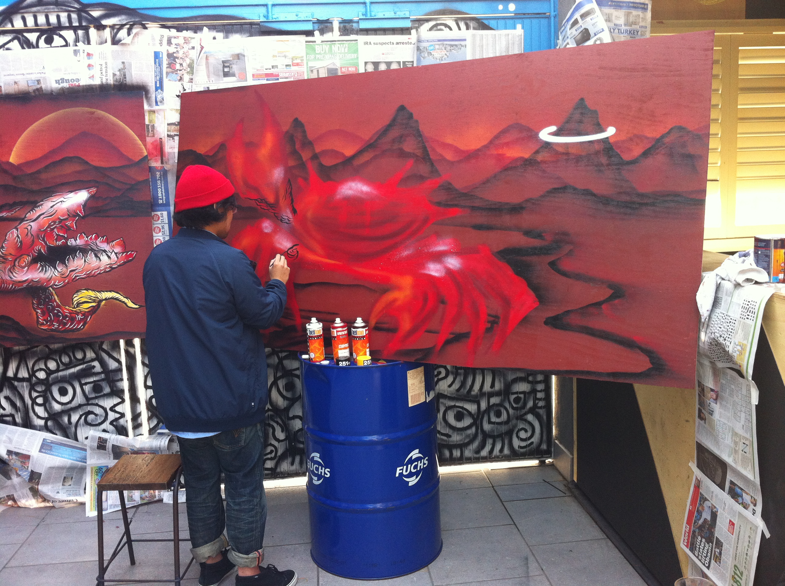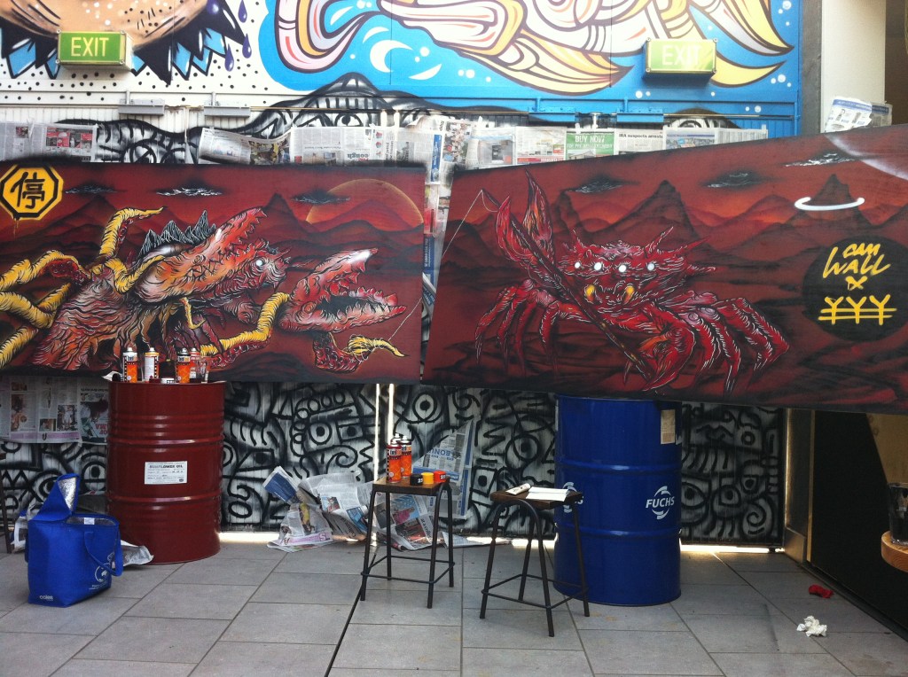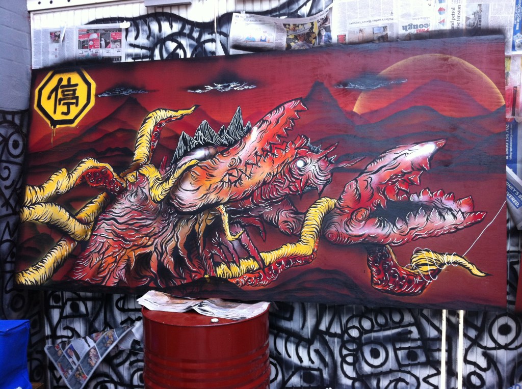 The theme was “Creole Cookout” – A fusion between Southern soul food and traditional Japanese. The concept of the mural was to depict two giant sized god-zilla/kaiju shellfish. This is what we came up with.